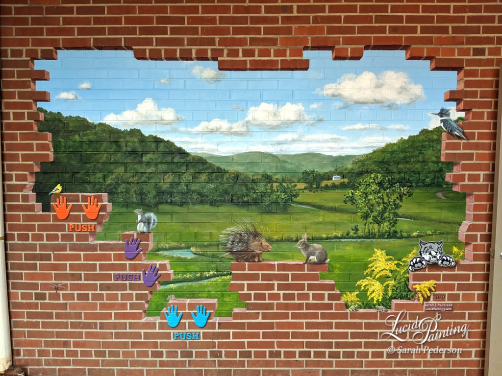 Paradise Paws Camp & Resort murals for new doggy daycare and kennel facility in Windsor, WI. 2019.The artist, Sarah Pederson, in front of Noah's Ark landscape at Footling Saints Learning Center in Prairie du Chien, WI. 2018.Children's rooms can be customized with a diversity of designs, color, and whimsy! Individual Residence, 2020.Fainting goats mural at individual residence nigh Viroqua, WI. 2018.Exterior poppy mural at private cottage along the Yahara River in McFarland, WI. 2016.3′ trompe l'oeil bluecoat. This is painted in acrylic on a apartment wall for Monroe County. Sparta, WI. 2017.DnA Vintners' exterior murals provide lots of interactive photo ops! La Crosse, WI. 2017.Interior mural at Deoxyribonucleic acid Vintners – In the Bog! Caledonia Street in La Crosse, WI. 2018.Trompe l'oeil opening along the sensory path at La Farge Simple School, WI. 2020.Sensory Path mural at La Farge Simple, WI. 2020.Bookshelf Mural at Coon Valley Elementary School Library Media Middle, Coon Valley, WI. 2015.Baseball cards mural with sew background, La Crosse Loggers Pro Shop, WI. 2017.100 Extraordinary Women Mural at the Westby Surface area Performing Arts Centre (WAPAC), commissioned by the Fine Arts Foundation of the Westby Expanse (FAFWA.) Westby, WI. 2018.Trompe l'oeil frieze mural in private residence, Onalaska, WI. 2018.Whimsical molar fairy landscape at Sedlock Dental on 7th and King Streets in La Crosse, WI. 2017.Sometimes a uncomplicated emphasis can add pure enjoyment to a room. 2017.Murals tin can transform an entryway into a magical getaway! Private residence in Onalaska, WI. 2016.Landscape mural opens up a conference room at Monroe County ADRC in Sparta, WI. 2017.Piano primal mural at Starting time Lutheran School in La Crosse, WI. Murals fill two walls in this large room. 2017.Trompe fifty'oeil book mural on false wood shelf, in memory of Henry Thomas. Knutson Memorial Library, Coon Valley, WI. 2014.This sweetness mural graces a wall in Prairie Catholic School's library in Prairie du Chien, Wisconsin. 2019.Trompe l'oeil Vino Barrel Landscape in private residence. Onalaska, WI. 2012.