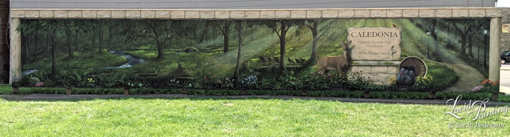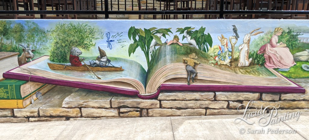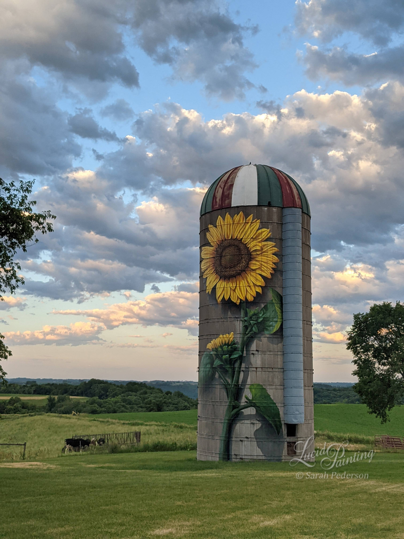38 Foot Sunflower landscape on a silo. Private Residence, Vernon Canton, WI. 2021.48 x 8 Human foot landscape mural with trompe l'oeil border, Downtown Pocket Park, Caledonia, MN. 2021.Particular, 48′ landscape landscape in Caledonia, MN. 2021.Trompe l'oeil windows let an oversized trumpet to spread music at Commencement Ev. Lutheran School in La Crosse, WI. 2020.Trompe l'oeil photo op wall at Nordic Creamery, Westby, WI. 2020.The artist with her nigh completed Angel Wing Mural in Coon Valley, WI. 2020.50′ Classic Book mural with characters and illustrations brought to life. Bekkum Memorial Library, Westby, WI. 2020